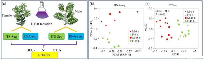 圖1展示了雌雄紅豆杉(T.mairei)樹木對UV-B輻射響應(yīng)的分析結(jié)果。a為在UV-B輻射下雌雄紅豆杉樹木的整合RNA-seq和ITS-seq分析流程。b為來自不同樣本組的RNA-seq數(shù)據(jù)集的主成分分析(PCA)。c為來自不同樣本組的ITS-seq數(shù)據(jù)集的動態(tài)meta-storms分析。