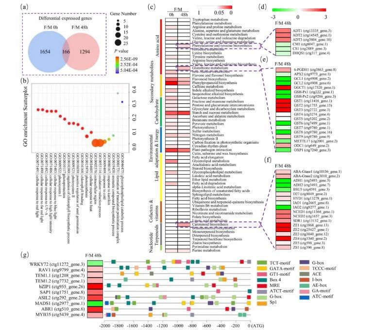 圖3展示了雌雄紅豆杉樹木之間差異表達(dá)基因的富集分析結(jié)果。a為在UV-B輻射下性別相關(guān)DEGs的韋恩圖,顯示不同性別樹木的DEGs數(shù)量。b為性別相關(guān)DEGs在多個環(huán)境脅迫相關(guān)GO富集分析。c為雌雄樹木之間代謝通路的差異性響應(yīng)。d為苯胺和酪氨酸生物合成相關(guān)基因的表達(dá)水平。e為谷胱甘肽代謝相關(guān)基因的表達(dá)水平。f為類胡蘿卜素生物合成相關(guān)基因的表達(dá)水平。g為光響應(yīng)順式元件在差異表達(dá)轉(zhuǎn)錄因子(TF)基因上游啟動子序列中的分析,不同顏色的方框表示不同類型的光響應(yīng)順式元件。
