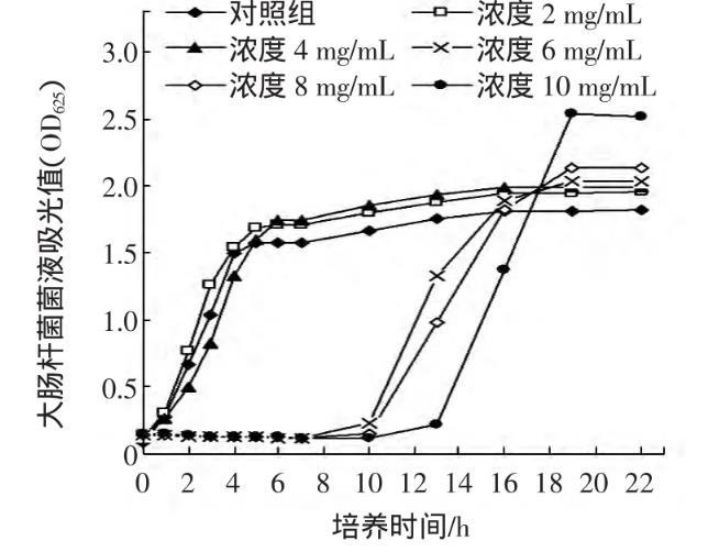 選擇不同濃度的乳鐵蛋白分別添加到大腸桿菌的培養(yǎng)基中,考察不同濃度的乳鐵蛋白對大腸桿菌生長的抑制或促進(jìn)作用,結(jié)果見圖2。