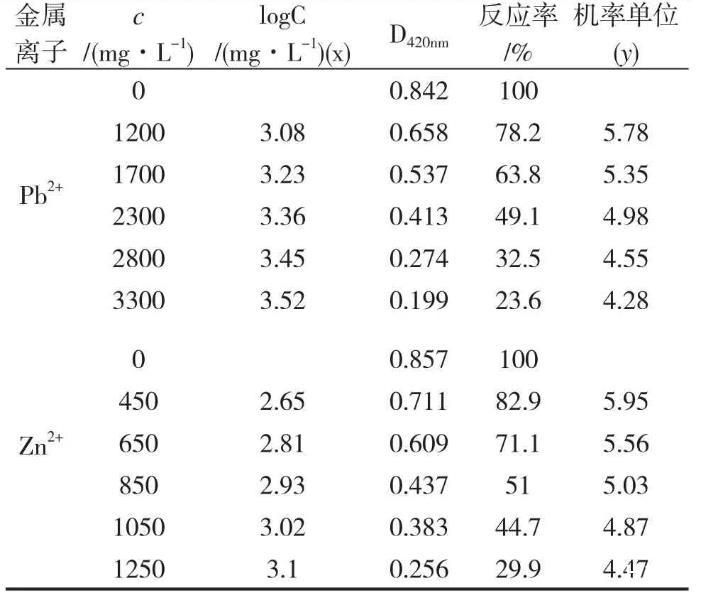 當機率單位為5時,分別通過上述方程(1)和(2)進行計算,得到鉛和鋅的濃度對數(shù)分別為3.32和2.96,再通過換算分別得到鉛和鋅抑制硫酸鹽還原菌生長的72h-EC50分別為2089.3mg·L-1和912mg·L-1。由此也再次說明鉛和鋅抑制硫酸鹽還原菌生長的毒性由大到小的順序仍是Zn2+>Pb2+。