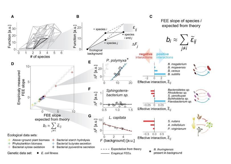為了驗(yàn)證這一理論,作者在前文提及的實(shí)驗(yàn)與數(shù)據(jù)集中測試并計(jì)算了物種間的有效相互作用,即通過分析每對(duì)物種在所有可能的背景下的功能變化,得出它們之間相互作用的平均效應(yīng)。通過對(duì)實(shí)驗(yàn)數(shù)據(jù)的深入分析,作者發(fā)現(xiàn),物種間的成對(duì)相互作用確實(shí)能夠解釋功能效應(yīng)方程中回歸斜率的變化(圖3D)。這意味著,一個(gè)物種對(duì)群落整體功能的貢獻(xiàn)不僅僅是孤立的,而是受到其與其他物種相互作用的影響(請(qǐng)注意,這里的相互作用是指物種對(duì)在所有生態(tài)背景下對(duì)群落水平功能的平均影響,并不一定對(duì)應(yīng)于兩個(gè)物種之間的直接正向或負(fù)向生態(tài)相互作用)。例如,他們發(fā)現(xiàn),具有強(qiáng)烈負(fù)相互作用的物種對(duì)群落功能的貢獻(xiàn)往往在具有高背景功能時(shí)顯著下降,而具有正相互作用的物種則在背景功能較高時(shí)能夠進(jìn)一步提升群落功能(圖3E-G)。