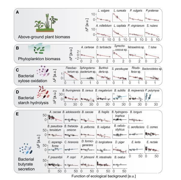 通過將一個(gè)物種添加到“生態(tài)背景”中的“功能效應(yīng)”與背景群落的功能聯(lián)系起來,可以很好地反映該物種的“功能效應(yīng)”。為了進(jìn)一步拓展研究范圍,探索微生物群落功能的全局上位效應(yīng)這一現(xiàn)象是否具有普遍性,作者重新分析了多個(gè)已發(fā)表的數(shù)據(jù)集,檢驗(yàn)全局上位效應(yīng)在不同生態(tài)環(huán)境中的適用性。作者通過分析細(xì)菌、植物和浮游植物的群落,確認(rèn)這些不同生態(tài)系統(tǒng)中的群落功能也可以通過全局上位效應(yīng)的模型進(jìn)行預(yù)測(圖2)。每個(gè)數(shù)據(jù)集涉及不同的物種組合、生態(tài)條件和群落功能(如生物質(zhì)生產(chǎn)、代謝活動(dòng)、酶分泌等),但簡單的統(tǒng)計(jì)模型能夠解釋各個(gè)數(shù)據(jù)集中約75%的功能效應(yīng)方差??梢钥吹?,大多數(shù)物種(約50%,紅線)的FEE呈負(fù)斜率,即我們?cè)诒尘敖榻B中提及的“收益遞減”或“成本增加”現(xiàn)象,這種在群體遺傳學(xué)中也十分常見。而少數(shù)物種(約5%,藍(lán)線)的FEE呈正斜率,即在功能較高的背景中加入該物種會(huì)更有益(或更無害)。