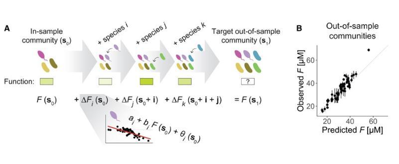 作者提出,F(xiàn)EE可以用于預(yù)測特定物種組合對(duì)群落整體功能的影響。具體實(shí)現(xiàn)的思路是,通過逐步累加每個(gè)物種的功能效應(yīng),來推斷一個(gè)新的群落組合的功能表現(xiàn)。通過先預(yù)測一個(gè)已知群落的功能表現(xiàn),然后逐步加入新的物種,利用FEE累加預(yù)測其功能的增減效應(yīng),從而得出目標(biāo)群落的最終功能: