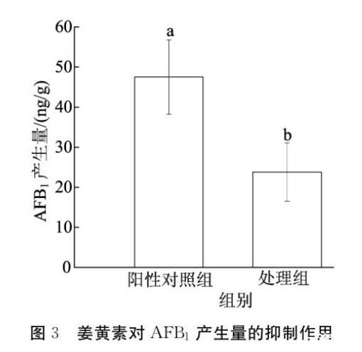 由圖3可知:姜黃素處理組的黃曲霉毒素B1的產(chǎn)生量為23.8 ng/g,污染陽性對照組的產(chǎn)生量為47.5 ng/g;相比之下,姜黃素處理組毒素降低了46.9%。分析結(jié)果可知,姜黃素能夠顯著降低黃曲霉毒素B1的產(chǎn)生(P<0.05)。因此,姜黃素作為天然的抑菌劑具有極大的開發(fā)潛力。