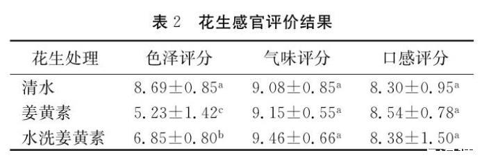 花生感官評價結(jié)果見表2所列。由表2可知,濃度為0.3 mmol/L姜黃素的加入并不會顯著影響花生的口感和氣味(P>0.05),但是對于花生的色澤產(chǎn)生了顯著性的影響(P<0.05),使用清水清洗后會顯著減少姜黃素對花生色澤的影響(P<0.05)。結(jié)果表明,姜黃素的加入并不會影響花生的氣味和口感,對姜黃素應(yīng)用具有重要的意義。