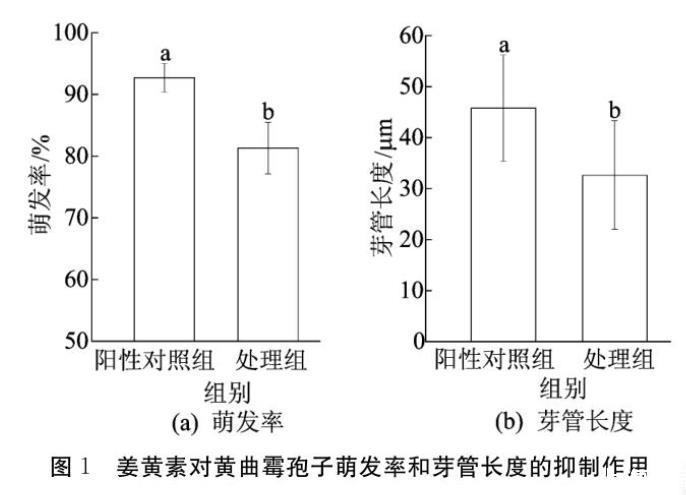 圖1姜黃素對黃曲霉孢子萌發(fā)率和芽管長度的抑制作用