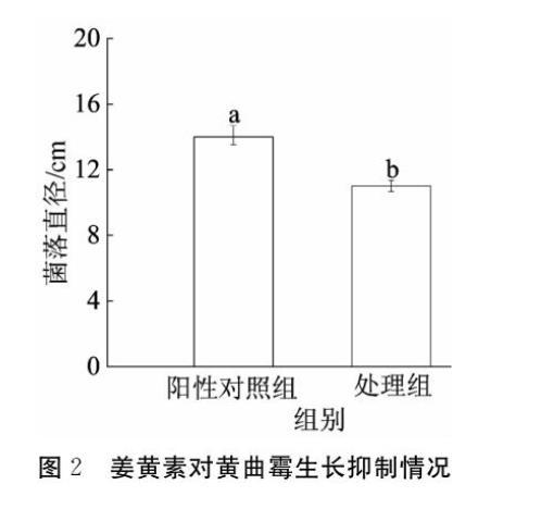 姜黃素對黃曲霉的抑制情況如圖2所示。從圖2可以看出:姜黃素處理后明顯地抑制了黃曲霉菌落的生長;相對于污染陽性對照組,黃曲霉正常生長直徑平均為14 cm,而姜黃素處理組的黃曲霉生長直徑為11 cm,抑制生長率為21.4%??梢钥闯?,加入姜黃素對黃曲霉的生長具有抑制作用(P<0.05)。