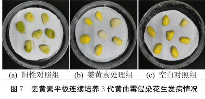 圖7姜黃素平板連續(xù)培養(yǎng)3代黃曲霉侵染花生發(fā)病情況