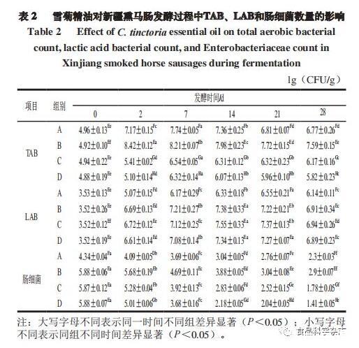 如表2所示,在整個(gè)發(fā)酵過程中,A、B、C和D組總TAB總數(shù)均呈先上升后下降的趨勢(shì),A、C和D組均在發(fā)酵第7天達(dá)到最大值,第28天分別降至6.77、7.59、6.17、5.82(lg(CFU/g))??梢?,雪菊精油對(duì)熏馬腸中細(xì)菌的生長(zhǎng)有顯著抑制作用(P<0.05)。