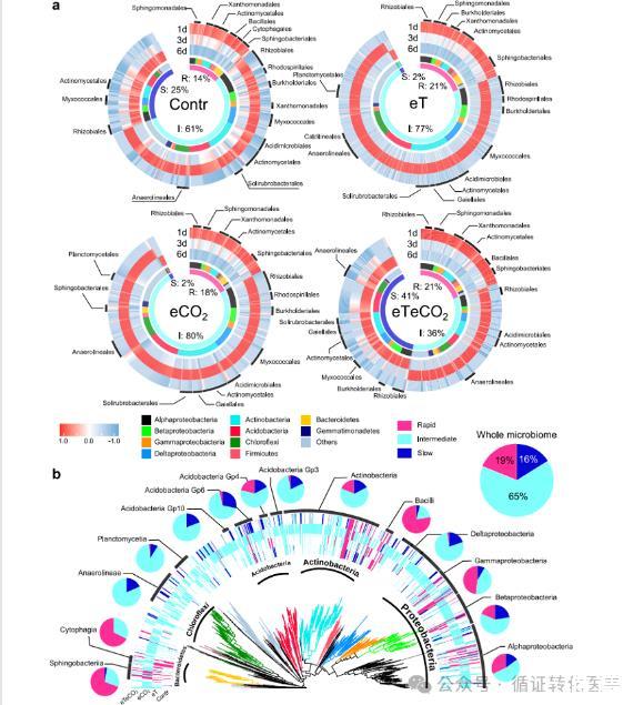 在生長策略發(fā)生變化的群系中,共有45個OTUs在三種處理比較中共享(即,對照vs eT,對照vs eCO2,對照vs eTeCO2),其中包括42個“生長加速”的OTUs和3個“生長延遲”的OTUs(圖4a,b)。基于這些OTUs的可視化的系統(tǒng)發(fā)育分布(圖4c),42個一致“生長加速”的OTUs顯示了一個廣泛分布于八個主要門的情況。大多數(shù)與α-變形菌門、β-變形菌門和γ-變形菌門相關(guān)的OTUs將其策略從“中間”轉(zhuǎn)變?yōu)椤翱焖佟薄T谶m應(yīng)氣候變化后,與δ-變形菌門、放線菌門、綠彎菌門和酸桿菌門相關(guān)的OTUs主要將其策略從“慢速”轉(zhuǎn)變?yōu)椤爸虚g”響應(yīng)??偟膩碚f,適應(yīng)氣候變化通過物種組成及其響應(yīng)策略的轉(zhuǎn)變重塑了微生物生長模式,最終影響了系統(tǒng)發(fā)育模式。