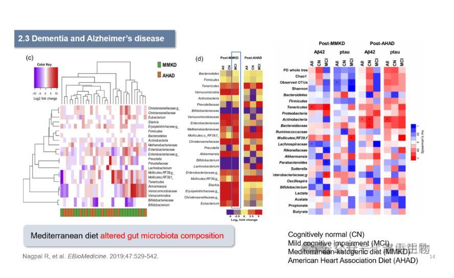 地中海飲食已被證明可以延緩阿爾茲海默癥(Alzheimer’s disease,AD)的發(fā)作。有研究顯示,不同的飲食模式會(huì)造就不同的腸道菌群分布,美國(guó)心臟協(xié)會(huì)飲食(American Heart Association Diet,AHAD)和改良地中海生酮飲食(Modified Mediterranean-ketogenic diet,MMKD)條件下的人類腸道菌群就存在著差異(圖c)。此外,堅(jiān)持MMKD改變了腸道微生物群組成,軟壁菌門(mén)、疣微菌門(mén)的增加、雙歧桿菌和毛螺菌的減少,此外,這種飲食的調(diào)整還改變了腸道菌群的多樣性(圖d)。這與AD生物標(biāo)志物如β-淀粉樣蛋白(Aβ42)和tau-p181相關(guān)。