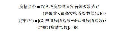 根據(jù)處理后桑椹發(fā)病時的表面菌絲覆蓋率,將發(fā)病桑椹進(jìn)行分級:0級,無發(fā)病桑椹;1級,桑椹表面菌絲覆蓋率0%–25%;2級,桑椹表面菌絲覆蓋率25%–50%;3級,桑椹表面菌絲覆蓋率50%–75%;4級,桑椹表面菌絲覆蓋率75%–100%。