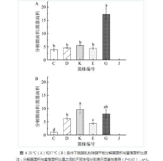 圖4展示了培養(yǎng)到5 d不同菌株在20℃和37℃的溫度下在乳粉瓊脂平板上分解圈面積與菌落面積的比值,以菌株在乳粉瓊脂平板上的分解圈直徑大小可反映細(xì)菌分解蛋白能力的強(qiáng)弱。乳粉瓊脂平板法底物為脫脂乳粉,數(shù)據(jù)分析表明不同分離株的乳粉蛋白分解能力存在顯著性差異(P<0.05)。在20℃條件下,分解圈面積/菌落面積的比值最大的是解淀粉芽孢桿菌(G),為17.36,分解圈面積/菌落面積的比值由大至小依次為解淀粉芽孢桿菌(G)、高山芽孢桿菌(K)、沙福芽孢桿菌(D)、沙福芽孢桿菌(E)、蠟樣芽孢桿菌(C)。在37℃條件下,分解圈面積/菌落面積的比值最大的是高山芽孢桿菌(K),為9.64,分解圈面積/菌落面積的比值由大至小依次為高山芽孢桿菌(K)、解淀粉芽孢桿菌(G)、沙福芽孢桿菌(D)、沙福芽孢桿菌(E)、蠟樣芽孢桿菌(C)。通過比較分解圈面積與菌落面積的比值大小,可以對6株菌株的蛋白分解能力進(jìn)行排序。在乳粉瓊脂平板試驗中,解淀粉芽孢桿菌(G)展現(xiàn)出較強(qiáng)的蛋白酶活性。發(fā)現(xiàn)解淀粉芽孢桿菌的蛋白分解能力較沙福芽孢桿菌和蠟樣芽孢桿菌更強(qiáng),并計算得出解淀粉芽孢桿菌的蛋白酶活力為2.55±0.02 U/mL。
