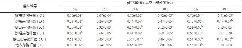 本試驗中以相同條件下空白組與菌株pH的差值體現(xiàn)菌株的產(chǎn)酸能力,表2與表3展示了在不同溫度下6株菌48 h內(nèi)的產(chǎn)酸情況。根據(jù)顯著性分析,在20℃下培養(yǎng)48 h,蠟樣芽孢桿菌(C)、高山芽孢桿菌(K)、沙福芽孢桿菌(E)和地衣芽孢桿菌(J)的pH變化顯著高于其他2株菌(P<0.05),其中蠟樣芽孢桿菌(C)和地衣芽孢桿菌(J)pH較空白組下降0.78;在37℃組中,培養(yǎng)至48 h的蠟樣芽孢桿菌(C)pH下降值仍顯著高于其他5株菌(P<0.05),為0.71。根據(jù)以上分析,蠟樣芽孢桿菌(C)的產(chǎn)酸能力顯著強(qiáng)于其他5株菌。