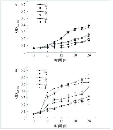 從圖1中可以觀察到細(xì)菌生長周期中的遲緩期、對數(shù)期和穩(wěn)定期,6株芽孢桿菌的生長速率各不相同。在兩個培養(yǎng)溫度下,蠟樣芽孢桿菌(C)和沙福芽孢桿菌(D)生長速率較快,在培養(yǎng)第3 h左右進(jìn)入對數(shù)生長期;而在20℃培養(yǎng)溫度下,地衣芽孢桿菌(J)生長速率較慢,第12 h左右才進(jìn)入對數(shù)期且OD值較低;在37℃培養(yǎng)溫度下,沙福芽孢桿菌(E)的生長速率較慢,24 h內(nèi)生長曲線上升緩慢。