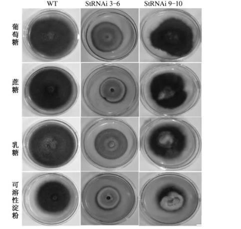 圖3碳源對(duì)StSte12基因調(diào)控玉米大斑病菌菌落形態(tài)的影響