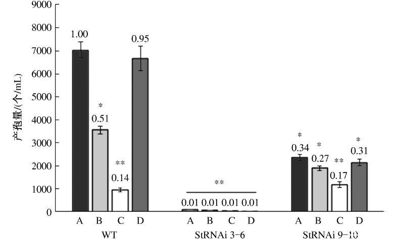 2.3碳源對(duì)StSte12基因調(diào)控玉米大斑病菌產(chǎn)孢量的影響