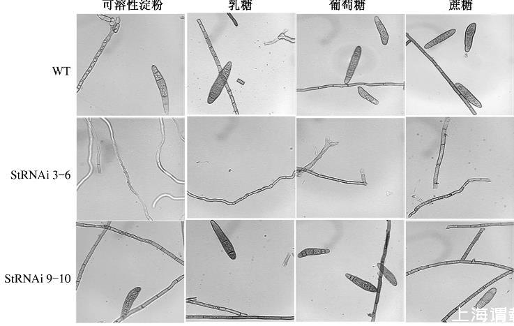 顯微觀察3種供試菌株在4種碳源培養(yǎng)基上的菌絲和分生孢子形態(tài),結(jié)果表明,StSte12基因RNAi陽性轉(zhuǎn)化子StRNAi 9-10與野生型菌株的分生孢子形態(tài)和菌絲形態(tài)在4種供試碳源培養(yǎng)基上基本一致。與其他2個(gè)供試菌株相比,StRNAi 3-6的菌絲纖弱,分節(jié)小甚至無分節(jié),顏色較淺,在葡萄糖、蔗糖和乳糖培養(yǎng)基上的表現(xiàn)基本一致,但在可溶性淀粉培養(yǎng)基上,菌絲顏色更淺,更纖細(xì),生長(zhǎng)勢(shì)更弱(圖5)。試驗(yàn)結(jié)果表明,StSte12基因?qū)τ衩状蟀卟【z長(zhǎng)勢(shì)和顏色有一定的調(diào)控作用,可溶性淀粉對(duì)該調(diào)控作用有一定的影響,此試驗(yàn)結(jié)果與2.1和2.2的結(jié)果一致。