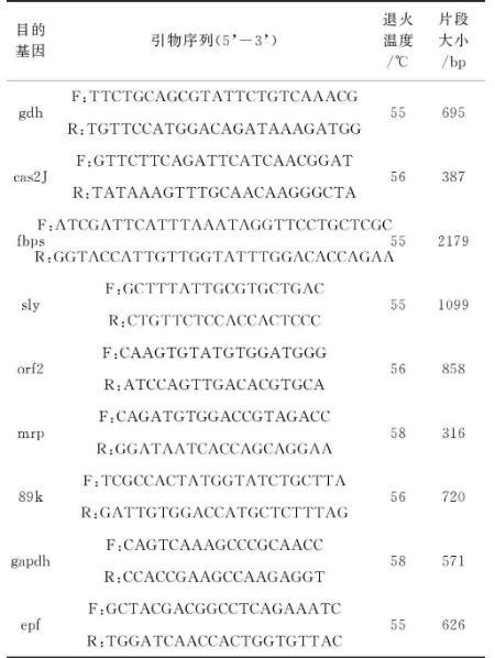 1.2.2.2 PCR引物選取豬鏈球菌屬保守基因gdh(谷氨酸脫氫酶),血清型特異性基因cas2J(莢膜多糖)以及7種主要毒力因子fbps(纖連蛋白原結合蛋白)、sly(溶血素)、orf2(毒力相關因子)、mrp(溶菌酶釋放蛋白)、89k(毒力島)、gapdh(甘油醛-3-磷酸脫氫酶)和epf(胞外因子)基因,參考文獻設計引物,引物序列見表1。