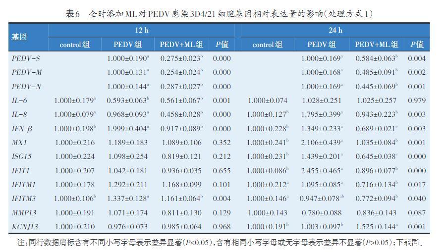 表6全時添加ML對PEDV感染3D4/21細胞基因相對表達量的影響(處理方式1)