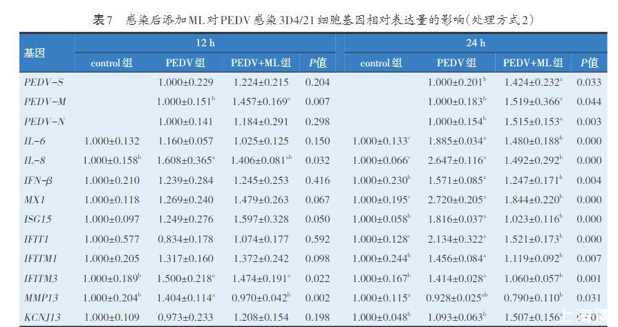 由表7可知,與PEDV組相比,PEDV+ML組在感染后添加ML處理12 h使PEDV-M基因的相對表達量顯著上調(P<0.05),處理24 h使PEDV-S、M、N基因的相對表達量顯著上調(P<0.05)。與control組相比,PEDV組在感染后添加ML處理12 h使IL-8、IFITM3、MMP13基因的相對表達量顯著上調(P<0.05),處理24 h使IL-6、IL-8、IFN-β、MX1、ISG15、IFIT1、IFITM1、IFITM3基因的相對表達量顯著上調(P<0.05)。與PEDV組相比,PEDV+ML組在感染后添加ML處理12 h使MMP13基因的相對表達量顯著下調(P<0.05),處理24 h使IL-6、IL-8、IFN-β、MX1、ISG15、IFIT1、IFITM1、IFITM3基因的相對表達量顯著下調(P<0.05),KCNJ13基因的相對表達量顯著上調(P<0.05)。