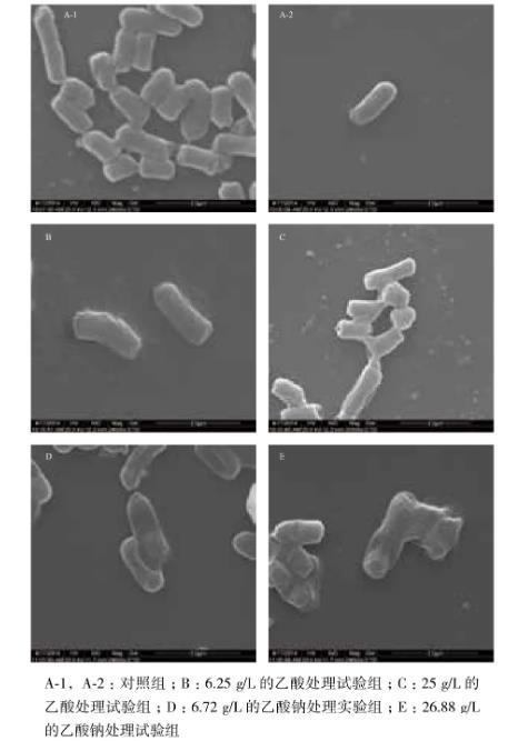 經(jīng)電子顯微鏡觀察對照組的重組大腸桿菌的形態(tài),如圖2中A-1、A-2所示,其細(xì)胞形態(tài)比較完整、飽滿。而試驗組中用不同濃度的乙酸、乙酸鈉處理過的重組菌,形態(tài)發(fā)生了不同的變化。其中,用濃度為6.25 g/L和25 g/L的乙酸處理過的菌體形態(tài)如圖2-B、2-C所示,用濃度分別為6.72 g/L和26.88 g/L的乙酸鈉溶液處理過的菌體形態(tài)如圖2-D、2-E所示。圖2-B顯示,菌體基本形態(tài)沒有較大變化,只出現(xiàn)較小的褶皺,而圖2-C中顯示菌體出現(xiàn)皺縮,菌體的形態(tài)受到較大影響。乙酸鈉處理后的細(xì)胞(圖2-D、2-E)顯示,細(xì)胞會發(fā)生凹陷,隨著乙酸鈉濃度的增大,細(xì)胞受損情況加重。