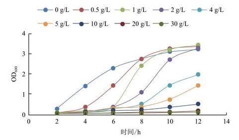 在一定范圍內(nèi),菌液的細(xì)胞濃度與吸光度值(OD值)成正比,試驗中采用OD600來衡量重組大腸桿菌的細(xì)胞密度。因此,通過測定OD值的變化來間接地表示乙酸鈉對重組菌生長的抑制情況。