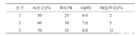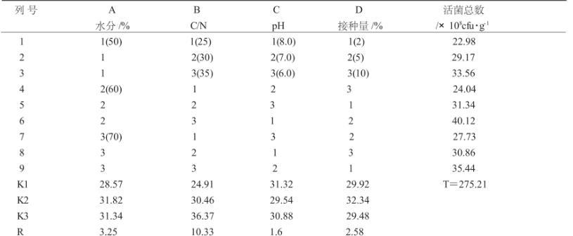 表1 復(fù)合菌劑在堆積發(fā)酵中最佳生長(zhǎng)條件 L9(34)正交設(shè)計(jì)