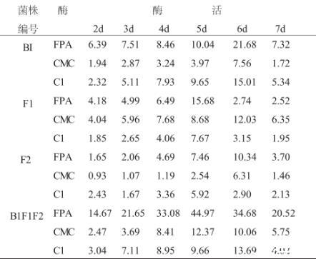 對(duì)7種樣品進(jìn)行系統(tǒng)分離,初篩獲得約20株菌,通過對(duì)菌落形態(tài)、生長(zhǎng)速度的觀察以及分解纖維素能力判定,挑選其中3株用PDA培養(yǎng)基平板進(jìn)行分離純化得到單個(gè)菌株B1、F1、F2。單個(gè)菌株B1、F1、F2以及它們相互混合對(duì)濾紙、羧甲基纖維素分解能力見表2、表3。從表2、表3可以看出:各菌株單獨(dú)培養(yǎng)對(duì)濾紙、羧甲基纖維素均有一定的分解效果,但不如混合的效果好,B1、F1、F2混合培養(yǎng)8d時(shí),濾紙失重率達(dá)到58.06%、酶相對(duì)活性0.93±0.00 cm·d-1,由此說明,3株菌株混合可以增加酶活力,各菌之間有很好的協(xié)同效應(yīng)。