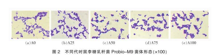 對鼠李糖乳桿菌Probio-M9 A0、A25、A50、A75和A100菌懸液進(jìn)行革蘭氏染色并在顯微鏡下觀察菌體形態(tài),發(fā)現(xiàn)鼠李糖乳桿菌Probio-M9連續(xù)傳100代菌體形態(tài)均屬于鼠李糖乳酪桿菌典型形態(tài),且在連續(xù)傳代過程中,各代時(shí)的菌體形態(tài)無明顯差異。
