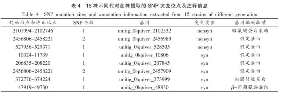 表4 15株不同代時菌株提取的SNP突變位點及注釋信息