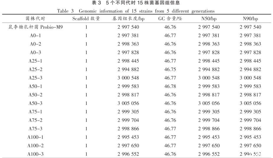 2.2.1基因組信息本研究中不同代時菌株組裝的基因組信息如表3所示,鼠李糖乳桿菌Probio-M9原始菌株基因組大小3.00 Mb,GC含量46.76%。傳代過程中菌株的平均基因組大小為(3.00±0.002)Mb,GC含量(46.76±0.007)%。