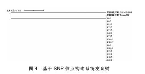 本研究中利用系統(tǒng)發(fā)育樹來描述傳代過程中菌株的進化關系,進而判斷菌株在連續(xù)培養(yǎng)過程中的穩(wěn)定性。以鼠李糖乳桿菌CNCM-I-3698作為外群,使無根樹轉為有根樹,鼠李糖乳桿菌Probio-M9原始基因組為參考基因組,使用Soapsnp方法得到的15個菌株的SNP位點連成序列,通過鄰接法(NJ法)構建系統(tǒng)發(fā)育樹。