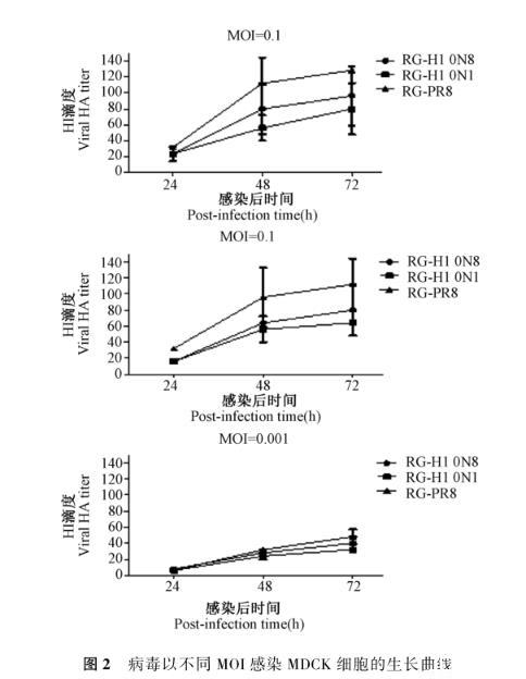 上述病毒滴度測定結(jié)果顯示MDCK細(xì)胞較Vero細(xì)胞對病毒更敏感,為了進(jìn)一步了解病毒在MDCK細(xì)胞上的生長情況,將病毒分別以不同的MOI感染MDCK細(xì)胞,從圖2中的結(jié)果可見三株病毒在不同的MOI感染后均呈現(xiàn)HA滴度隨時間增加的趨勢;在MOI=0.1和MOI=0.01感染時,在24 h時三株病毒HA滴度相差不大,雖然所有病毒感染48 h后滴度均明顯上升,72 h后滴度繼續(xù)上升,同時鏡下觀察細(xì)胞CPE較48 h明顯,但是兩株H10重配病毒的HA滴度在48 h和72 h時均明顯低于RG-PR8病毒,重配病毒之間差異不大;在MOI=0.001時,三株病毒HA滴度均較低,病毒之間HA滴度差異不大。