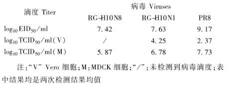 為了檢測兩株病毒在不同培養(yǎng)介質(zhì)上的敏感性,將病毒分別感染Vero、MDCK和SPF雞胚,同時以RG-PR8病毒做對照,結(jié)果顯示在雞胚和MDCK上,三株病毒均能檢測到病毒滴度,在MDCK細(xì)胞上的滴度從低至高分別相差約10倍,依次是RG-H10N8