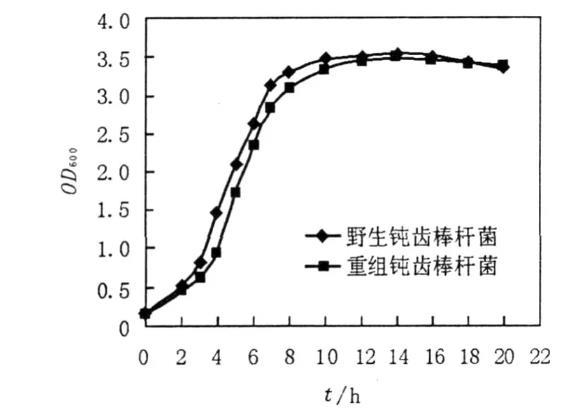 圖1野生鈍齒棒桿菌和重組鈍齒棒桿菌的生長曲線