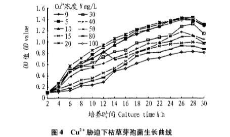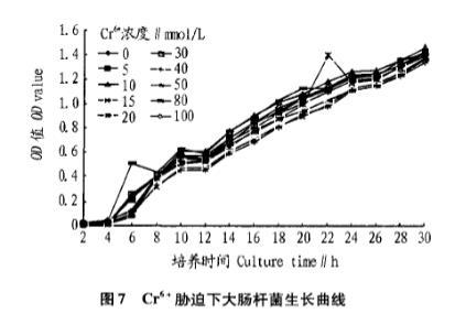 由圖3可知,cu2+往濃度5~15 mg/L時(shí)對(duì)大腸桿菌的生長(zhǎng)無(wú)明顯影響,cu濃度為2O~30m L對(duì)大腸桿菌的生長(zhǎng)具有一定的促進(jìn)作用,cu2+濃度為40~100mg/L時(shí),表現(xiàn)出對(duì)大腸桿菌生長(zhǎng)的抑制作用(80mg/L時(shí)例外,可能是測(cè)量誤差所致),Cu濃度為100m#L時(shí)抑制作用最明顯。由4可知,cu濃度為5、15、20mg/I對(duì)枯草芽孢桿菌的生長(zhǎng)具有一定促進(jìn)作用,cu濃度從30~100mg/L對(duì)枯草芽孢桿菌的生長(zhǎng)的抑制作用逐漸增強(qiáng),但隨著培養(yǎng)時(shí)間的延長(zhǎng),2種細(xì)菌仍有生長(zhǎng),兇此cu對(duì)2種細(xì)菌的毒性沒(méi)有Hg2對(duì)2種細(xì)菌的毒性強(qiáng),在銅對(duì)土壤微生物毒性的研究中表明,低濃度銅對(duì)土壤微生物生物量有顯著刺激作用,高濃度時(shí)則有抑制作用,與該試驗(yàn)結(jié)果基本相似。