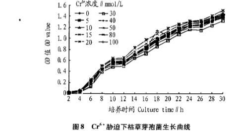 由圖5~8可知,Ph、Cr6+對(duì)2種細(xì)菌的生長(zhǎng)影響不明顯,沒(méi)有明顯的規(guī)律性,重金屬可以改變微生物的數(shù)量和區(qū)系結(jié)構(gòu)、生理類(lèi)群和生理生化反應(yīng),同時(shí)微生物也通過(guò)調(diào)節(jié)其結(jié)構(gòu)和生理狀況,或者形成能在自然環(huán)境中廣泛傳播的質(zhì)粒,完善遺傳基,以適應(yīng)不良環(huán)境,不同的微生物對(duì)重金屬的敏感程度不同;Pacheco等發(fā)現(xiàn)重金屬抗性細(xì)菌中100%帶有質(zhì)粒,顧奇萍等認(rèn)為隨著P}1濃度的升高,耐鉛細(xì)菌總數(shù)先增多后減少。,試驗(yàn)中細(xì)菌對(duì)低濃度的Pb有一定的依賴性,因此細(xì)菌最適Pb2+濃度為2.0mmol/L,并且從鉛鋅尾礦土分離到的耐鉛細(xì)菌有93.1%被檢測(cè)到含有質(zhì)粒,而對(duì)照土中分離到的耐鉛細(xì)菌僅90.3%的細(xì)菌被檢測(cè)到含有質(zhì)粒;王俊麗等在28℃培養(yǎng)7d后,在P}1濃度為300mr=/L的PDA培養(yǎng)基上有細(xì)菌生長(zhǎng)”;而很多的微生物對(duì)金屬鉻尤其對(duì)六價(jià)鉻具有抗性,該試驗(yàn)中大腸桿菌和枯草芽孢桿菌的增殖對(duì)PI1“、Cr6表現(xiàn)出較高的耐受性,可能與上述分析有關(guān)。