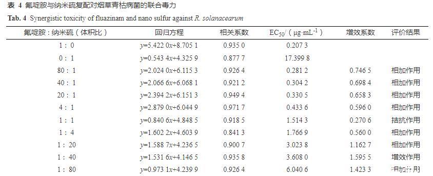 表4氟啶胺與納米硫復(fù)配對煙草青枯病菌的聯(lián)合毒力