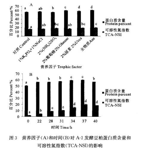 圖3營養(yǎng)因子(A)和時間(B)對A-1發(fā)酵豆粕蛋白質含量和可溶性氮指數(TCA-NSI)的影響