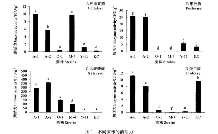 纖維素酶活力測定參照王琳等的檢測方法;木聚糖酶活力測定參照費迪波;果膠酶活力測定參照陳小湘;蛋白酶酶力測定參考趙彩艷;蛋白質用凱氏定氮法,可溶性氮總含量的測定用TCA-NSI法。