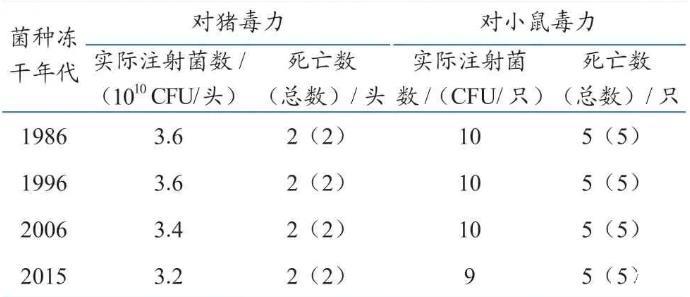 1986、1996、2006、2015年4個凍干代次的CVCC43005株菌種按照最小致死劑量攻擊豬,均可使豬全部死亡,毒力檢定結(jié)果(表4)均符合要求。根據(jù)不同凍干代次CVCC43005株菌種毒力檢定結(jié)果,CVCC43005株菌種毒力檢定標準為取56~63日齡健康易感豬2頭,經(jīng)靜脈注射菌液5.0 mL/頭(活菌濃度不高于7.0×109CFU/mL),觀察4 d,應全部死亡;取18~22 g小白鼠5只,經(jīng)皮下注射菌液0.2 mL/只(活菌濃度不高于50 CFU/mL),觀察7 d,應全部死亡。