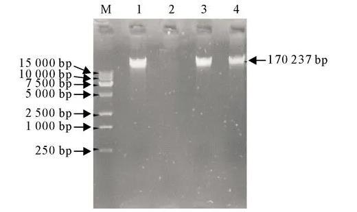 M.DNA標準DL 15 000;1.vB_EcoM-IME540核酸;2.DNaseⅠ;3.RNase A;4.Mung Bean Nuclease