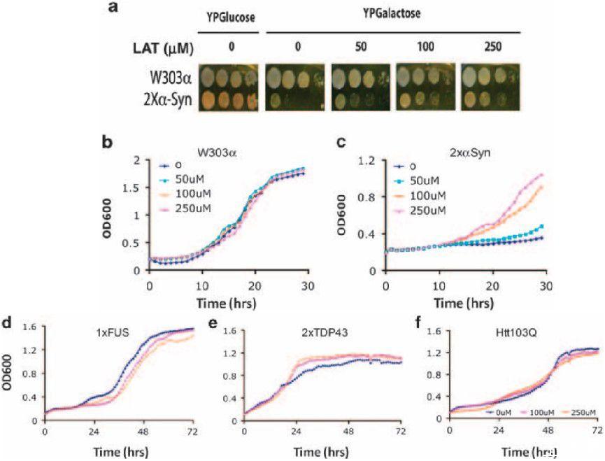 圖1、latrepirdine可保護(hù)釀酒酵母免受α-syn的細(xì)胞毒性,但不能保護(hù)TDP-43、FUS或Htt-103Q的細(xì)胞毒性。(a)2XαSynstrain及其同源野生型(W303α)菌株在棉子糖培養(yǎng)基中生長(zhǎng)到菌落中期,稀釋后分別點(diǎn)在YPG葡萄糖平板(α-syn“關(guān)閉”)和YPG半乳糖平板(α-syn開(kāi)啟)上,在沒(méi)有或有l(wèi)atrepirdine的情況下(照片攝于生長(zhǎng)2天后30℃下)。(b)W303α或(c)2XαSyn菌株在YPG半乳糖培養(yǎng)基(α-syn處于“開(kāi)啟”狀態(tài))中,在沒(méi)有或有l(wèi)atrepirdine的情況下生長(zhǎng)(濃度如圖所示)。(d)1XFUS、(e)2XTDP43和(f)1XHtt103Q菌株在YPG半乳糖培養(yǎng)基中生長(zhǎng)(表達(dá)“開(kāi)啟”),沒(méi)有或有不同濃度的latrepirdine(如所示)。所有數(shù)據(jù)均為三個(gè)或三個(gè)以上獨(dú)立實(shí)驗(yàn)的結(jié)果。