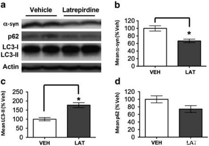 圖4、latrepirdine刺激α-突觸核蛋白(α-syn)分解,同時(shí)增強(qiáng)自噬標(biāo)記物。兩個(gè)月大的野生型雄性小鼠連續(xù)21次腹腔注射3.5mg/kg latrepirdine(n=4;LAT)或等體積的空白(0.9%生理鹽水;n=4;VEH)。(a)對(duì)野生型小鼠大腦中可溶性α-syn、p62和LC3蛋白水平的Western印跡分析。(b-d)Western印跡條帶整合密度定量。圖示為具有代表性的同胎仔鼠;