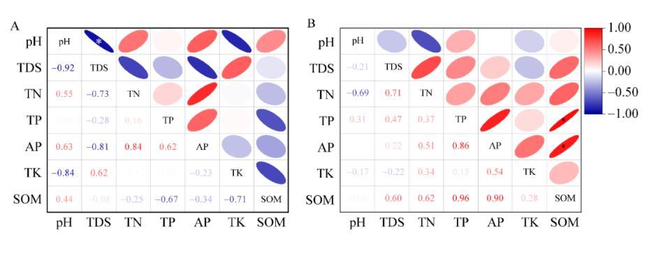 對土壤細菌群落中相對豐度排前10的優(yōu)勢菌門與土壤理化因子進行Spearman相關性分析(圖8B),結果表明所選7個理化因子中TDS、TN、TP、AP和SOM與相對豐度前10的菌門具有顯著性差異,其中AP與放線菌門和綠屈撓菌門呈現(xiàn)極顯著負相關關系(P<0.001),相關系數(shù)分別為?0.636和?0.746。TN主要影響變形菌門、擬桿菌門、脫硫桿菌門和疣微菌門,且與它們都呈負相關關系。pH和TK與相對豐度前10的優(yōu)勢菌門均無顯著性差異,與細菌主要呈正相關關系,且與優(yōu)勢菌門的相關性系數(shù)r<0.4。