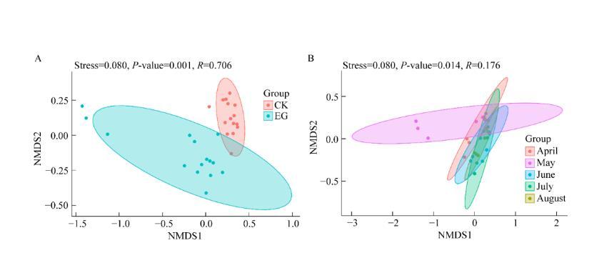 利用基于Bray-Curtis距離的NMDS方法評估不同種養(yǎng)模式及不同月土壤細菌群落的相似性,結果見圖7。Stress<0.2表明圖形具有較好的表現(xiàn)意義,R>0表示分組有效,P<0.05為顯著性差異,橢圓是質心周圍的95%置信區(qū)間。由圖8可知,ANOSIM統(tǒng)計檢驗顯示,CK與EG土壤細菌群落的組成存在顯著差異(Stress=0.080<0.2,P-value=0.001,R=0.706),同時CK和EG土壤細菌群落與不同采樣月有顯著差異(Stress=0.080<0.2,P-value=0.014,R=0.176。結果表明引入蟹后對細菌群落結構組成的影響遠大于采樣月的影響。