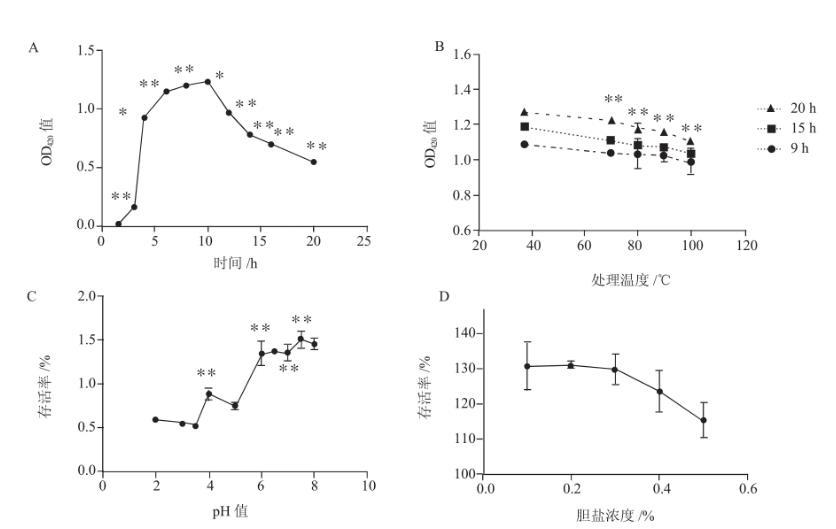 對生長曲線觀察發(fā)現(xiàn),該菌株無明顯的生長延滯期,生長對數(shù)期為0~6 h,生長穩(wěn)定期為6~10 h,生長衰亡期為第10小時(shí)以后(圖2-A)。以1.5 h的OD420為標(biāo)準(zhǔn),不同時(shí)間點(diǎn)的OD420值與其均差異極顯著(P<0.01)。