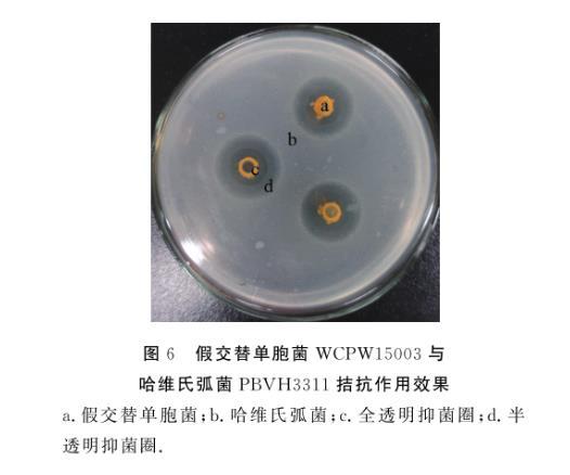 當哈維氏弧菌PBVH3311密度為106cfu/mL時,假交替單胞菌WCPW15003的最小抑菌密度為107cfu/mL,抑菌圈直徑為(18.15±0.09)mm;當哈維氏弧菌PBVH3311密度為107、108cfu/mL時,假交替單胞菌WCPW15003的最小抑菌密度均為108cfu/mL,抑菌圈直徑分別為(18.53±1.34)、(11.68±2.58)mm。拮抗作用效果為全透明抑菌圈,外側(cè)還有一圈半透明抑菌圈(圖6)。