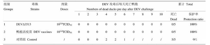重組病毒DEVΔ3513以103.0TCID50/只、104.0TCID50/只劑量,免疫麻鴨后14 d,均能100%抵抗DEV強毒攻擊(表2),表明UL56基因下游3 513 bp缺失后仍具有良好免疫原性。